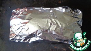 Затем противень застилаем фольгой и смазываем соком ту часть фольги, на которой будет находится мясо (центр фольги).