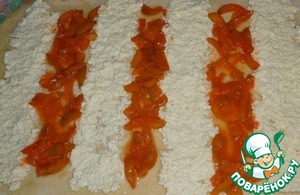 • Тесто раскатать в пласт, но не сильно тонко. Теперь выкладываем наши начинки полосками чередуя их.