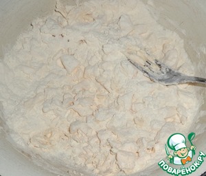 • Желтки отделяем от белков. Желтки и сахар добавляем к муке. Замесить тесто.