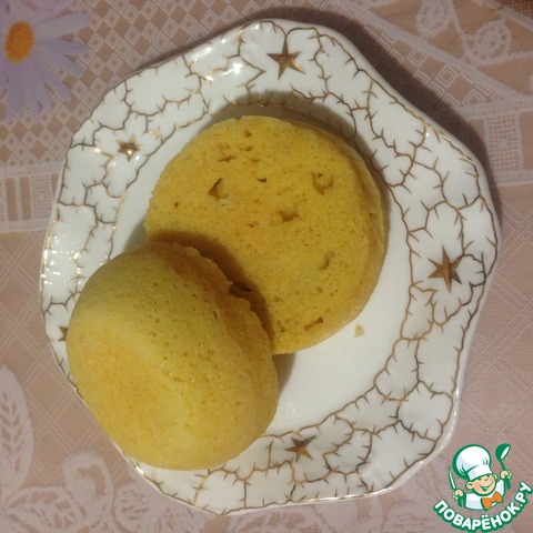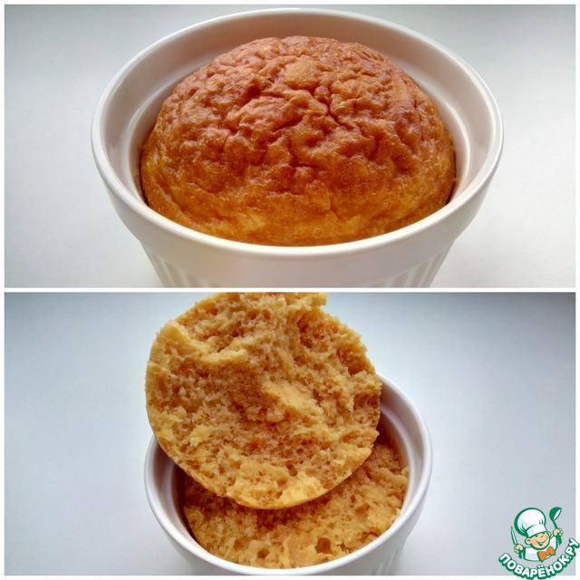Испекла вместо формочки в обычной кружке (поставила ее в глубокую тарелку с водой), в микроволновке запекала три минуты.
