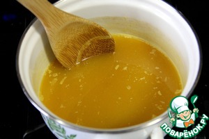 Смешиваем апельсиновое варенье, апельсиновый сок и мед и нагреваем на среднем огне помешивая до однородности.