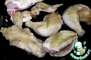 Разогреваем сковороду с оливковым маслом и слегка обжариваем куски курицы сначала кожей вниз до чуть золотистого цвета, а потом перевернув, с другой стороны.