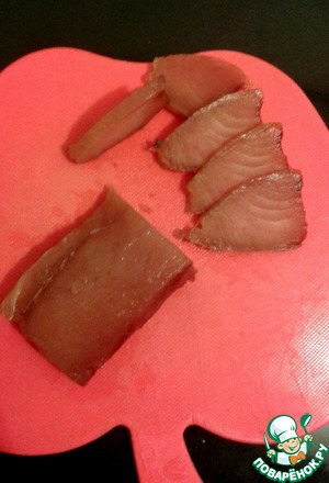 Нарезаем тунец ломтиками толщиной около 4 мм
