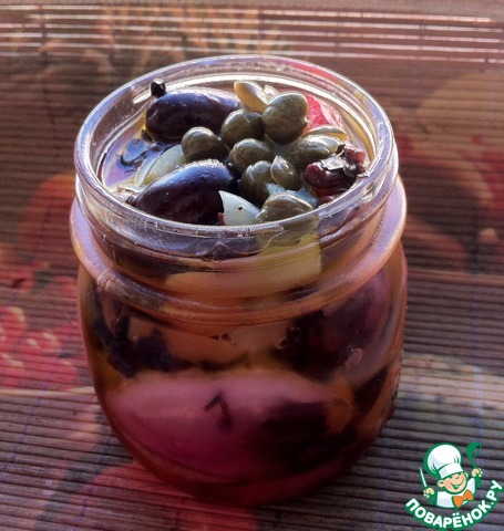 9. Выкладывать овощи слоями в стерилизованные банки, прокладывая рубленным базиликом, маслинами, оливками и чесноком.