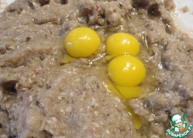 Теперь очередь яиц. Я взяла три перепелиных, т. к. на такое количество фарша одного куриного будет много. На такое же количество фарша можно взять куриное яйцо, разбить его в отдельную емкость, сбейтe в однородную массу. Потом половину этой массы добавить в фарш, а половину использовать для омлета или запеканки.
