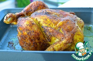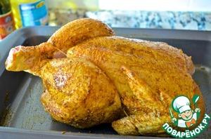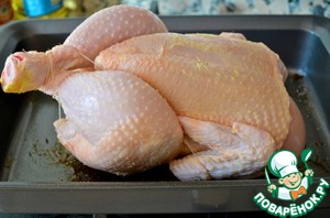 4. Запекать в духовке при температуре 200 градусов 45 – 60 минут в зависимости от размера курицы и особенности вашей духовки.