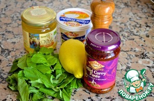 5. Для соуса положить пасту карри, мёд, лимонный сок, сметану и листья мяты в блендер и прокрутить все быстро.