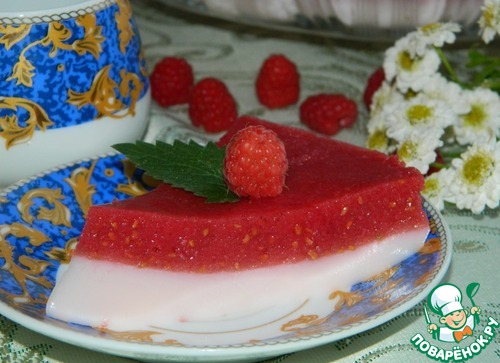 Застывшее желе разрезаем на пирожные и украшаем малиной.