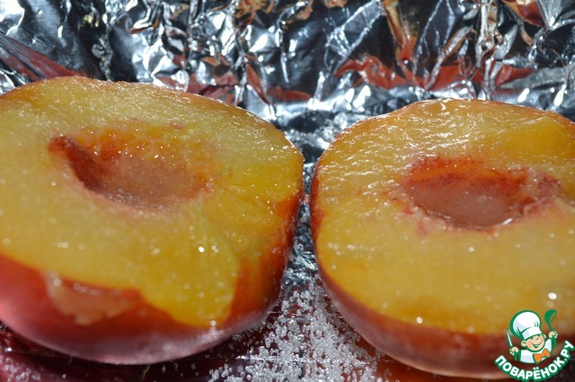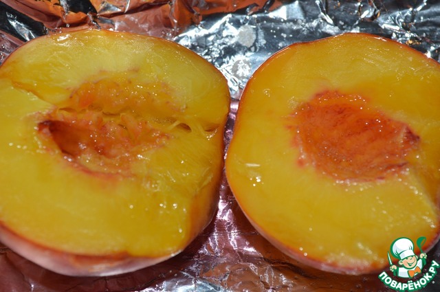 Если персики жесткие и/или не очень сладкие, то положите их в жаропрочную форму, посыпьте сахаром и полейте коньяком. Запекайте в духовке 15 минут при температуре 200 С.