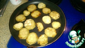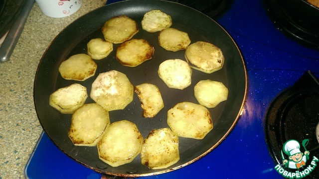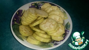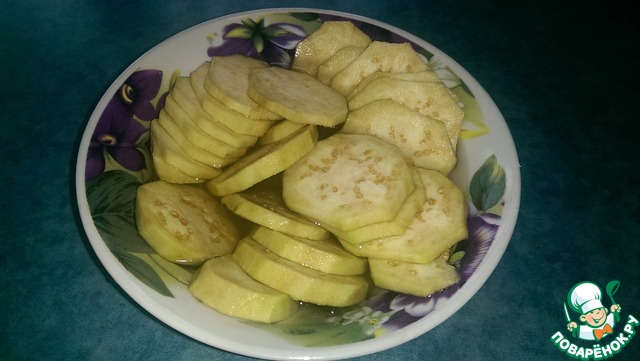 Баклажаны очистить от шкурки, нарезать кружочками и оставить в подсоленной воде.