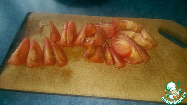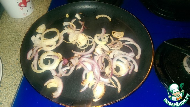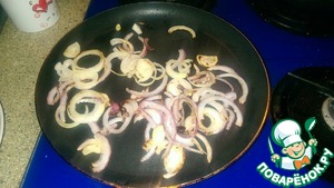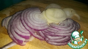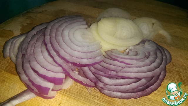 Лук нарезать полукольцами. Я взяла 50 гр. репчатого и 50 гр., красного лука.