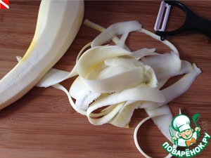 Очищаем кабачок и овощечисткой нарезаем его на тонкие полосочки.