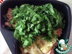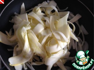 Добавляем "лапшу" из кабачка. Тушим 5-7 минут, кабачок должен оставаться полуготовым.