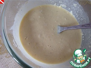 Готовим заливку: смешиваем сливки, яйца, натертый сыр, горчичу, муку. Солим и перчим по вкусу.