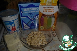 5. Выливаю горячую массу в подогретую посуду для взбивания. Перемешивая, постепенно добавляю сухое молоко и дробленые орешки кешью.