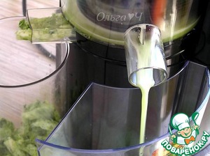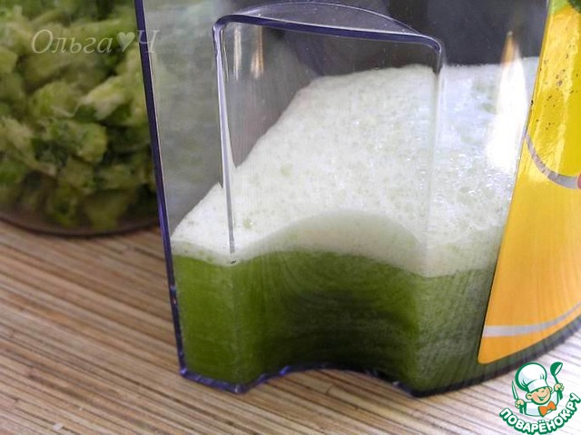 На поверхности сока образовалось больше пены, чем обычно, поскольку огурец и кабачок достаточно водянистые и быстрее проходят через соковыжималку.