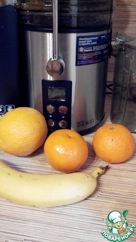 Чистим апельсин и мандарины от кожуры. Делим на 4 части и погружаем в горловину соковыжималки. Включаем программу CITRUS. Сока много, очень много в жмых попадают только перегородки! Красота!!!