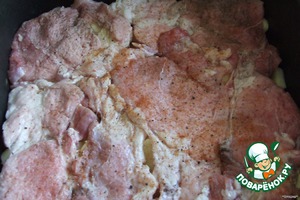 Мясо отбить, посолить, поперчить и выложить сверху на картофель.