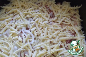 Лук порезать полукольцами и выложить сверху на мясо ровным слоем.