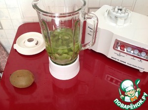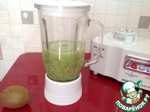 Киви нарежем кубиками, поместим в блендер, добавив туда 400 г воды и 60 г сахара. Сделаем пюре.