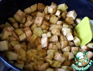 Имбирь натереть на мелкой терке, баклажаны нарезать кубиками.