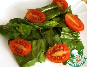 Начинаем собирать салат. На тарелку выкладываем заправленные листья шпината, добавляем помидоры черри, разрезанные пополам.