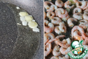 Начнем с приготовления креветок. На сковороде раскалить масло, добавить несколько ломтиков имбиря и чеснока, обжарить их одну минуту. Затем на очень сильном огне обжарить в этом же масле креветки, не более двух минут. Вынуть их из масла, остудить ( и постараться не съесть раньше времени, они получаются очень вкусными)