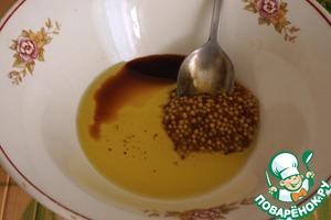 В миске смешаем горчицу, бальзамический уксус и масло оливковое.