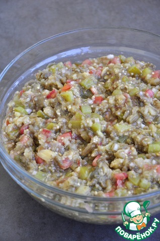 Очищенный перец нарезать кубиком, баклажаны порубить ножом (ни в коем случае не в мясорубке, блендере, миксере, только ножом и только руками).