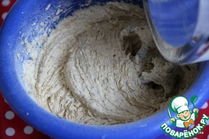 На малых оборотах ввести сухие составляющие в тесто (оно довольно-таки крутое получается, т. е. падает кусками, а не стекает с венчиков)