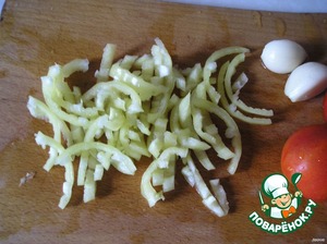 • Над сковородой на тёрочке натираем помидоры, оставляя шкурки в руке. Выдавливаем чеснок туда же. Минутки 2 прижариваем.