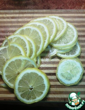 Лимон вымыть, нарезать очень тонкими кружочками. "Попки" лимонные хорошо срезайте, а то будет сильно горчить.