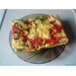 8. Разложите на поверхности теста в произвольном порядке кусочки томатов, сладкого перца, салями, украсьте оливками без косточек.