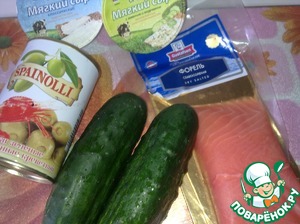 Соединяем половинки огурцов и разрезаем их на кусочки. Украсьте огурцы слабосолёной форелью и оливками. Приятного аппетита!