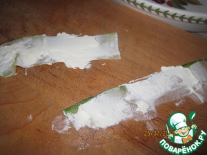 Молоденькие кабачки разного цвета, морковь нарезаем тоненькими полосками овощечисткой. Полоски кабачков промазываем творогом Альметте сливочный.