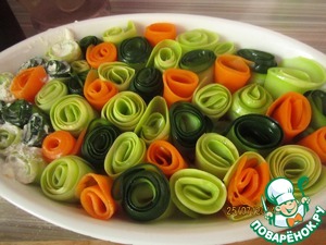 Полоски скручиваем рулетиками и устанавливаем в форму. Между рулетиками по желанию втыкаем кусочки помидор, лука, перца.