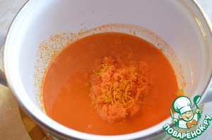 В кастрюле смешать, сахар, морковный сок и жмых, апельсиновый сок и цедру, воду (150 мл).