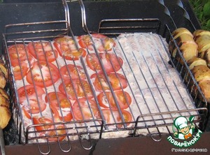 Уложили в барбекюшницу (в решетку), в данном случае народ захотел с помидорами - на половинку положили помидоры. Правда, они прилипли к решетке... Но вкус отдали!