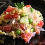 4. Теперь ополоснув лапшу добавим ее к овощам. Обжарим все вместе для обмена вкусами и ароматами! Нарезаем томаты черри половинками и в салат на сковородку.