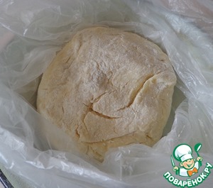 Замесить тесто. Накрыть пищевой пленкой и убрать на час в холодильник.