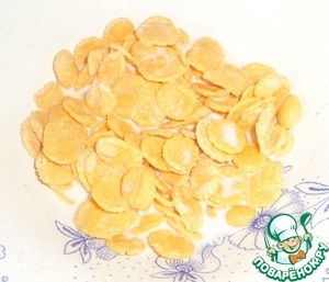 Кукурузные хлопья залить молоком и оставить пока тесто находится в холодильнике.