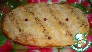 Уважаемые мои, хочу предложить вашему вниманию овальный пирог, сделанный на основе рулета. В качестве начинки использовала творог и мед, кукурузные хлопья, а сверху пирог украшен глазурью из свежевыжатого апельсинового сока, грецкими орехами и кокосовой стружкой.