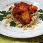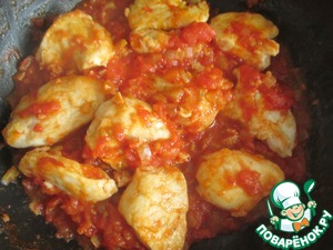 Готовить 15 минут на среднем огне, разминая кубики помидоров. Посередине готовки попробовать соус, если он кислит, можно добавить еще меда для смягчения вкуса. Затем добавить кусочки филе и готовить еще 5 минут.