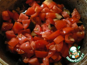 Нарежьте крупными кубиками помидоры. Или дольки пополам. Когда баклажаны немного поджарятся, положите туда помидоры. Пусть тушатся.