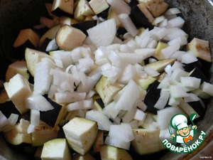 Баклажаны нарежьте довольно крупными кубиками. ПОложите в разогретое масло, пусть немного обжарятся. Сверху насыпьте покрошенный лук (это как хочется, так и режьте). При перемешивании потом тоже пожарится.