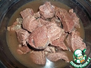 Сразу оговорюсь, что этот расход продуктов рассчитан на большую (как у меня) семью, так что вы можете смело уменьшить данное количество. Говядину нарезать кусочками и отварить до готовности (Я в процессе варки мяса, кроме соли добавляю смесь перцев, зелень и лук).