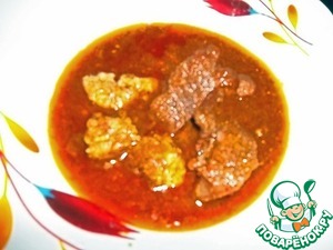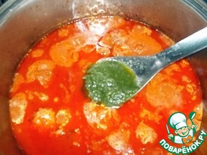Добавить кусочки мяса и влить бульон, в котором оно варилось (у меня 2 стакана). После закипания добавить мелко порезанную зелень по вкусу (у меня измельченные в блендере петрушка, лаврушка и базилик). Из специй я добавляю кориандр и смесь перцев. Так как я брала мясной бульон, то соль не добавляла.