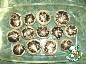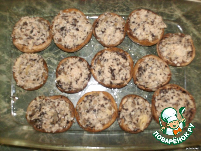 Грибы очистить, отделить шляпки от ножек и при помощи чайной ложки из шляпок выбрать грибную массу.