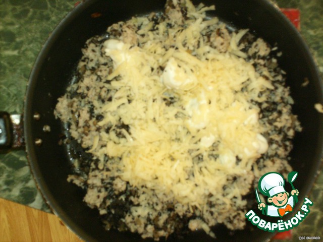Затем смешать с курицей и тертым сыром, посолить. Добавить немного майонеза.