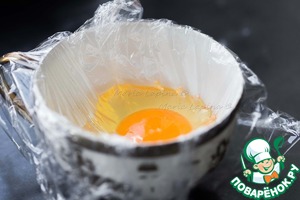 В чашку положить пищевую пленку, сазать растительным маслом и разбить в неё яйцо. Поднять края и завязать их. Старайтесь, чтобы в пленке было меньше воздуха.